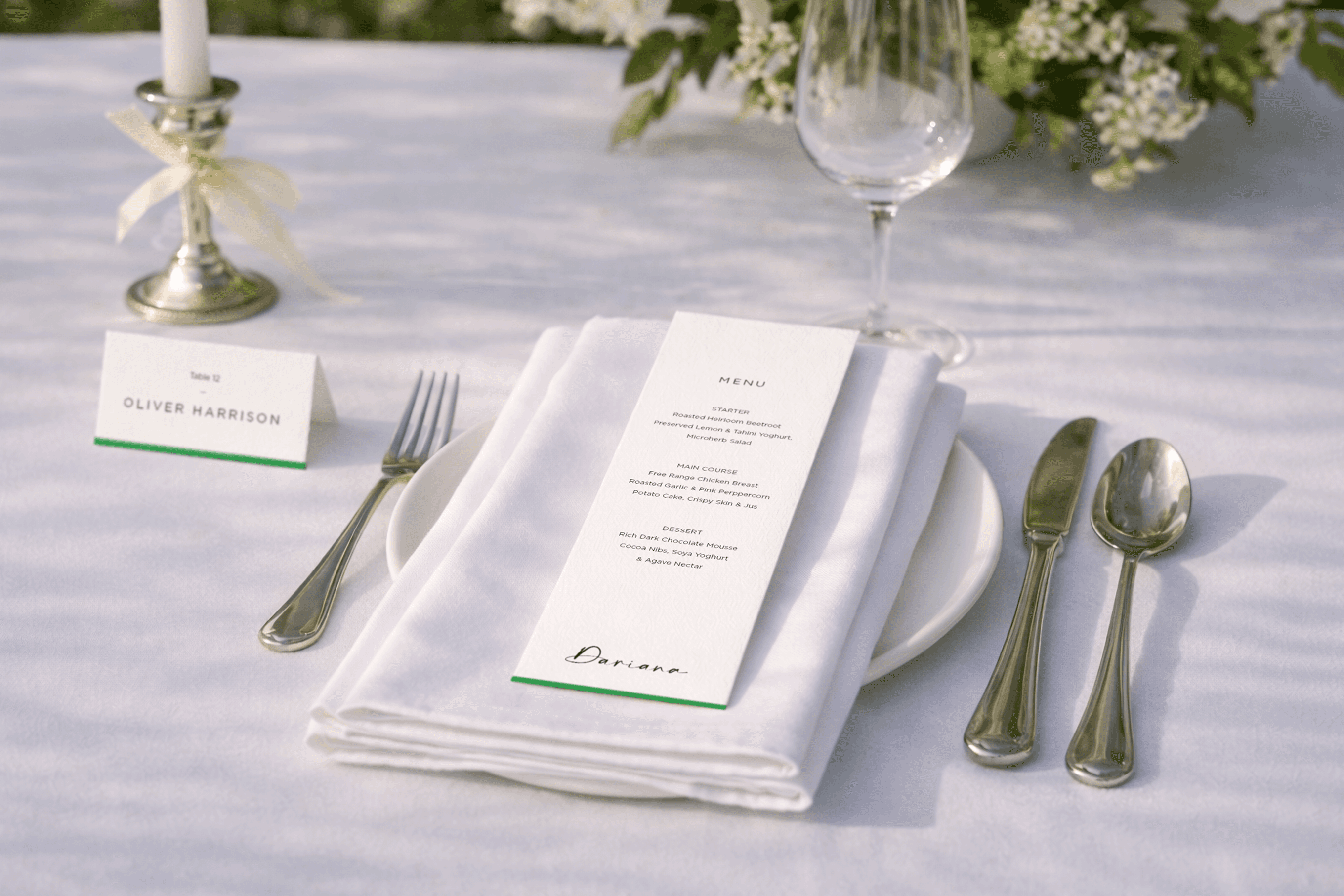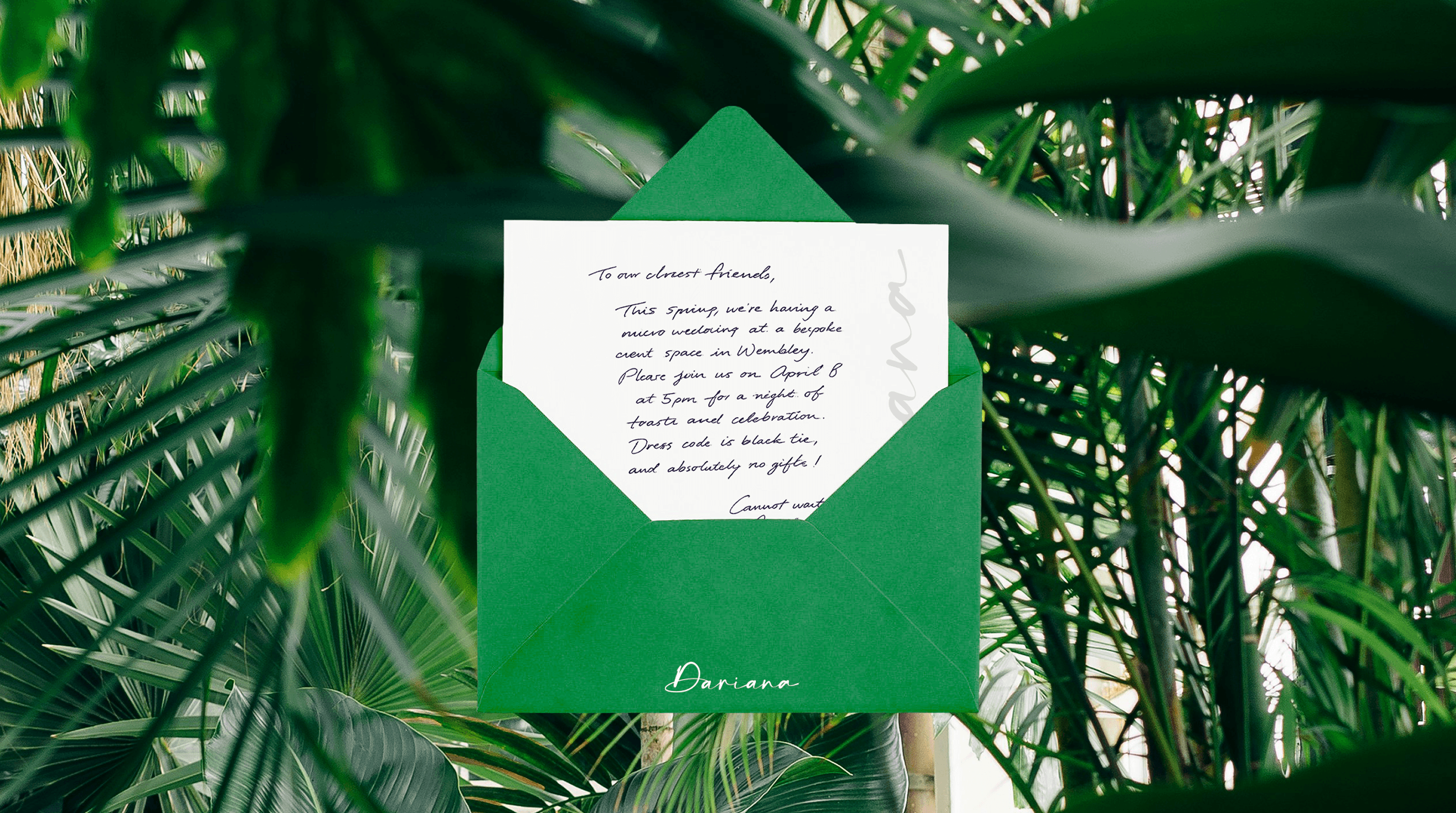 Dariana is a luxury event space on the top floors of Dandi's Wembley building, designed primarily for weddings and celebrations. The name is a fusion of two names and a nod to the venue's role in bringing lives together. We created a visual identity that bought in more warmth and personalisation to the space, without overpowering the striking interiors already in place.