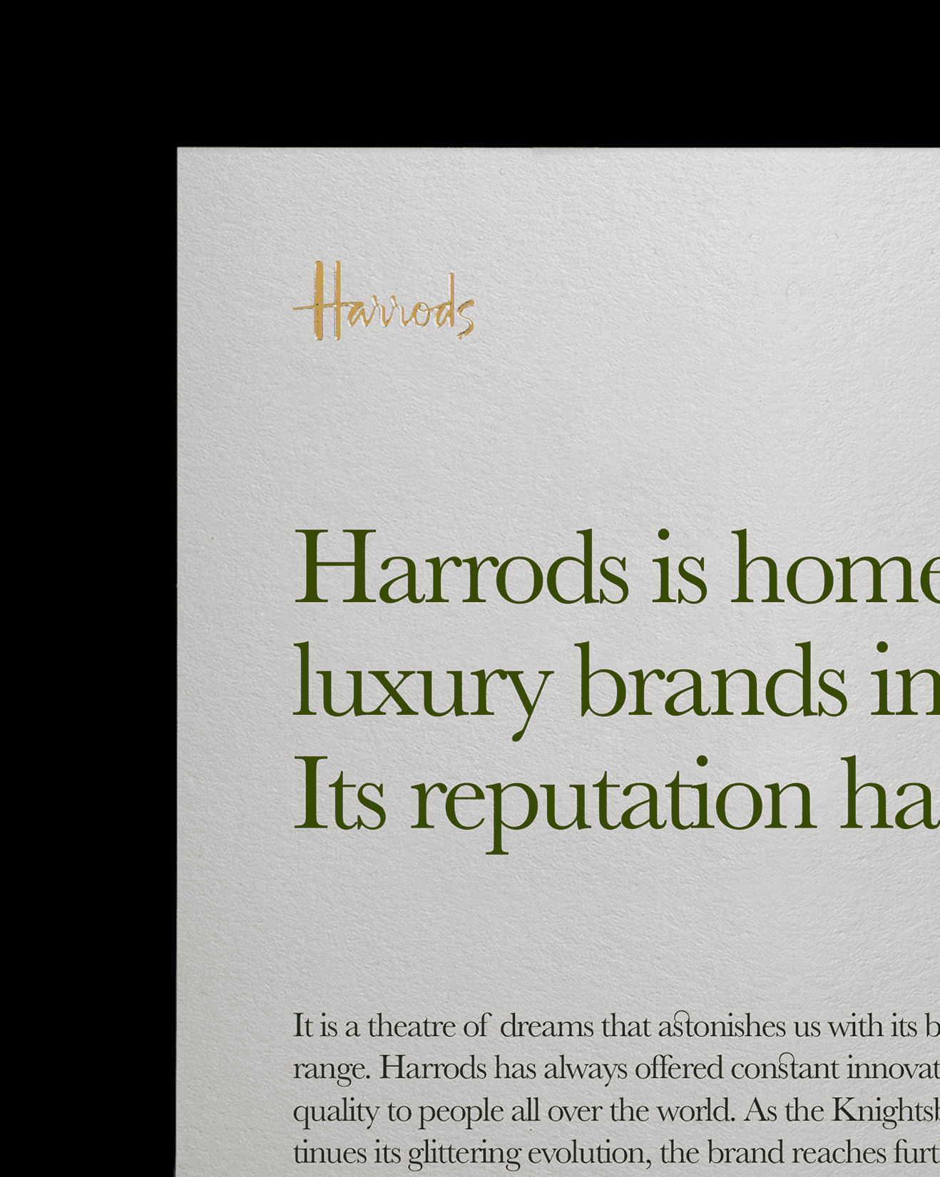 Developed to bring clarity, consistency, and confidence across every touchpoint, the guidelines provide a considered framework for how the brand is expressed—balancing heritage with the demands of a modern, global audience. From core identity principles to their application across environments and communications, the system ensures that Harrods remains unmistakably itself, wherever it appears.